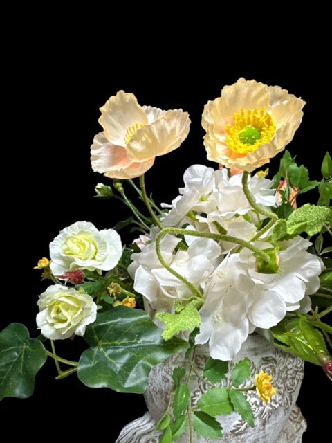 Een teder bloemstuk vol symboliek, met kunstbloemen in zachte tinten van ivoor, perzik en fris lentegroen.