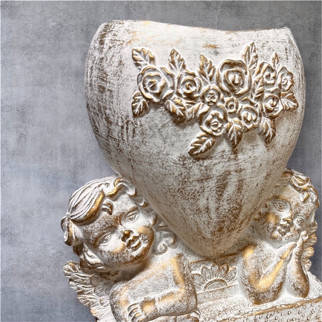 De bloemen zijn stevig verwerkt in een sierlijke vaas met rozen reliëf, gedragen door twee liefdevolle engelen die op hun schouders een hart omhoog houden – symbool van eeuwige liefde en verbondenheid.
